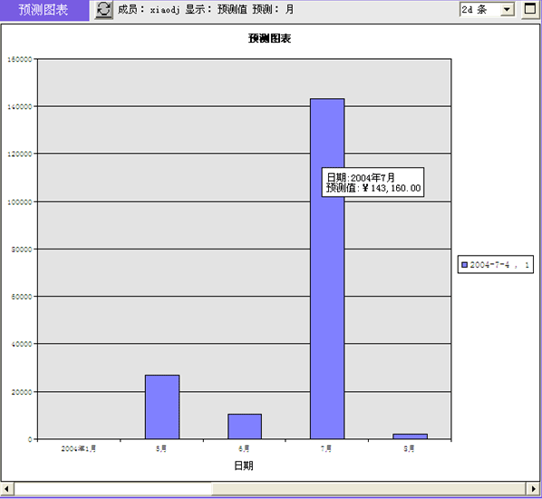 * 100% = 504,402.50元的一個(gè)預(yù)測(cè)值,在相同時(shí)間段的機(jī)會(huì)預(yù)測(cè)值將被累計(jì)求和。很顯然,可以在不同時(shí)間點(diǎn)(例如6月1日、7月1日、8月1日、9月1日)多次對(duì)2004年9月的銷售額進(jìn)行預(yù)測(cè)。得到一系列的銷售預(yù)測(cè)值變動(dòng)趨勢(shì)。