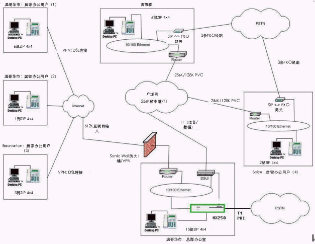 系統(tǒng)的安裝是由蘇迪思科技公司的認(rèn)證增值分銷商Xiologix 來實現(xiàn)的。在45分鐘內(nèi)Xiologix 的工程師就設(shè)定和調(diào)試完畢MX250并且完成了第一期20部蘇迪思ZIP4x4 IP電話的安裝。一個月后Consani Associates公司又進行了系統(tǒng)擴展追加了30個用戶許可和另外30部ZIP4x4 IP電話。Consani Associates 公司采用蘇迪思科技的MX250系統(tǒng)后的公司系統(tǒng)網(wǎng)絡(luò)拓樸圖如下: