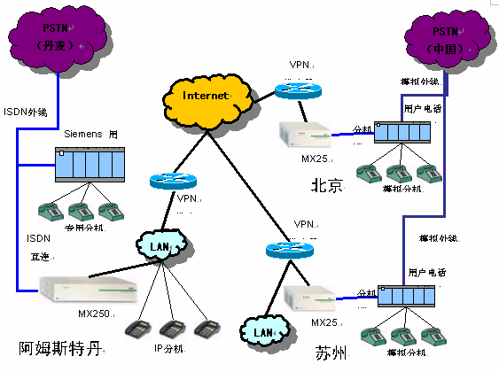 在阿姆斯特丹配置一臺(tái)MX250交換機(jī),通過(guò)ISND連接原有交換機(jī)及丹麥PSTN網(wǎng)絡(luò),北京安裝一臺(tái)MX25網(wǎng)關(guān)與原有集團(tuán)電話(huà)互聯(lián),蘇州安裝一臺(tái)MX25與原有呼叫中心互聯(lián),三點(diǎn)通過(guò)基于Internet的VPN組成專(zhuān)用VOIP網(wǎng)。