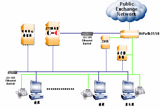 搜易得呼叫中心系統(tǒng)采用SIEMENS HiPath3000通信平臺,融合了商路通公司(www.SynRoute.com )的CTI中間件,為呼叫中心系統(tǒng)的應(yīng)用開發(fā)提供了功能完善、系統(tǒng)穩(wěn)定、可靠性高、擴展性強等特點的呼叫中心開發(fā)平臺。根據(jù)客戶業(yè)務(wù)需求實現(xiàn)呼叫中心系統(tǒng)主要功能:自動語音應(yīng)答、ACD分配、統(tǒng)計報表、監(jiān)控、錄音等;其中呼叫中心平臺中的業(yè)務(wù)系統(tǒng)還包含了客戶資料管理、產(chǎn)品資料管理、售后服務(wù)管理、售前支持管理、問卷調(diào)查管理、訂單監(jiān)督管理。整套系統(tǒng)很好地滿足了該中心的業(yè)務(wù)需求。