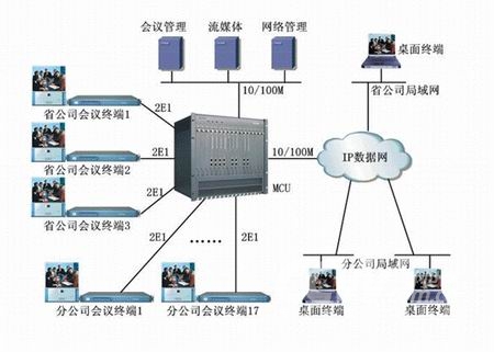 該系統(tǒng)基于蘇州科達(dá)公司KDV系列視頻會(huì)議產(chǎn)品,全網(wǎng)采用1套MCU、20套會(huì)議室型終端和200多套桌面型終端,其中會(huì)議室型終端通過(guò)2條E1線路捆綁與MCU相連、桌面型終端通過(guò)10/100M以太網(wǎng)和IP數(shù)據(jù)網(wǎng)與MCU相連。總體網(wǎng)絡(luò)結(jié)構(gòu)如下圖所示: