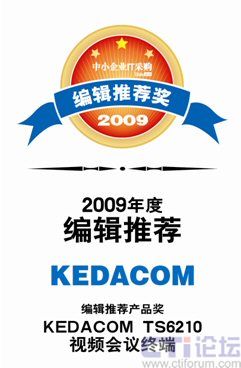 CTI論壇(ctiforum)05月20日消息: 近日,由《中小企業(yè)IT采購》舉辦的2009年度編輯推薦獎評測活動落下帷幕,科達TS6210視頻會議終端以其卓越的視音頻質量、優(yōu)異的網(wǎng)絡適應性、極高的性價比在本次評選活動中脫穎而出,獲此殊榮。