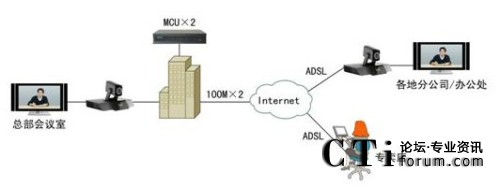 整個方案在部署上極其簡單,紅豆集團總部架設一臺KDV8000C多點控制單元和一臺KDV8000E多點控制單元,全國各地分公司/辦事處的會議室各部署一套TrueSens硬件視頻會議終端,而遍布全國的紅豆男裝專賣店、軒帝尼專賣店內(nèi)則分別部署一套科達軟件視頻會議終端。集團總部采用電信、聯(lián)通的百兆寬帶各一條,各地的分支機構(gòu)和專賣店則均通過普通的ADSL接入。系統(tǒng)拓撲圖如下: