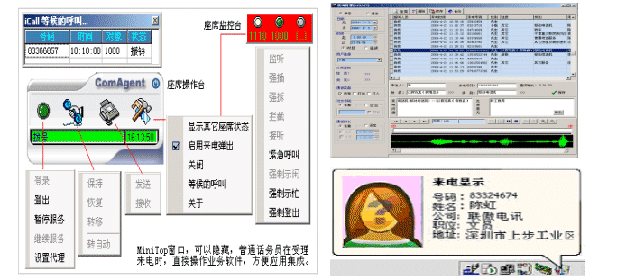 座席操作界面分類設計為Mini Top方式,可隨時隱藏或顯示;座席控件將來電號碼或在流程中收集的信息通過事件傳遞給業(yè)務系統(tǒng),話務員受理來電時,直接看到的是業(yè)務處理界面。