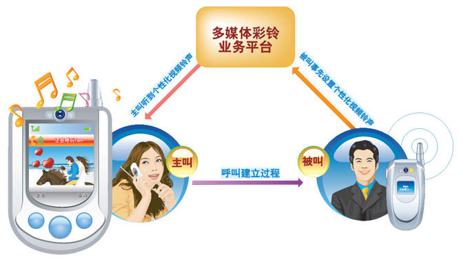 多媒體彩鈴業(yè)務由被叫用戶申請,可以根據不同的主叫用戶分類提供不同的回鈴流媒體。提供一種基于不同主、被叫的差異化、多媒體鈴音服務。
