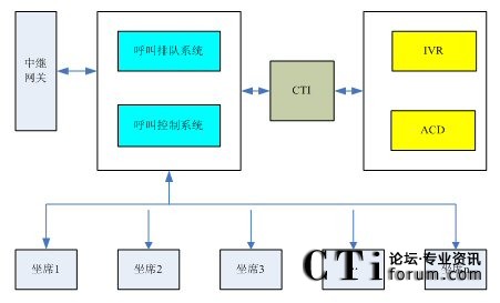 呼叫排隊(duì)系統(tǒng)首先將進(jìn)入系統(tǒng)的呼叫進(jìn)行排隊(duì),并將新來(lái)的呼叫上報(bào)給IVR系統(tǒng)。IVR系統(tǒng)向排隊(duì)的用戶播放提示音樂,同時(shí)ACD系統(tǒng)根據(jù)呼叫分配策略選擇一個(gè)空閑的坐席。在選定坐席以后,CTI接口將呼叫控制命令傳到呼叫控制系統(tǒng),呼叫控制系統(tǒng)將呼叫轉(zhuǎn)接到指定的坐席。坐席人員開始對(duì)客戶的呼叫進(jìn)行應(yīng)答受理。