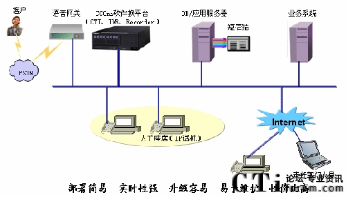 有沒(méi)有辦法讓數(shù)量占多數(shù)的中小集團(tuán)客戶也能享受IP呼叫中心的好處呢?在一個(gè)日益成熟的開放市場(chǎng)中,答案是肯定的。目前已經(jīng)有國(guó)內(nèi)廠商針對(duì)這塊市場(chǎng)在進(jìn)行耕耘,我們可以看看國(guó)內(nèi)在這方面走在前列的廠商大唐高鴻新推出的針對(duì)中小企業(yè)的IP呼叫中心產(chǎn)品SS3000-C。SS3000-C,采用純IP技術(shù),利用先進(jìn)的軟交換技術(shù),系統(tǒng)可伸縮性極強(qiáng),可隨客戶需要進(jìn)行靈活建設(shè)。