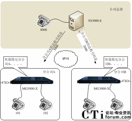- 總部給各分公司只分配一個號碼,做為分公司的總機接入號碼,例如給分公司A分配的號碼3000。