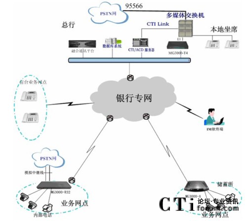 本設(shè)計(jì)方案在內(nèi)蒙中行總部的專網(wǎng)配置統(tǒng)一的控制管理平臺(tái)用于對(duì)下面各網(wǎng)點(diǎn)終端的統(tǒng)一控制管理,另外配置多E1 IP數(shù)字中繼網(wǎng)關(guān)和中行內(nèi)部的電話銀行交換機(jī)對(duì)接,實(shí)現(xiàn)IP話路和中行的電話銀行系統(tǒng)的互聯(lián)。下面各網(wǎng)點(diǎn)、理財(cái)中心部署IP專線電話終端,用于銀行客戶在各營(yíng)業(yè)網(wǎng)點(diǎn)拿起話筒就自動(dòng)自動(dòng)撥號(hào),通過銀行專網(wǎng)進(jìn)入電話銀行系統(tǒng)進(jìn)行語(yǔ)音互動(dòng)。