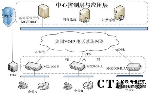 各單位利用自己的網(wǎng)絡(luò)組建集團(tuán)VOIP語(yǔ)音網(wǎng)絡(luò)。無(wú)論是在國(guó)內(nèi)的各單位總部及其分支還是海外的企業(yè)分支,不管是通過(guò)專網(wǎng)還是ADSL等連入集團(tuán)管理平臺(tái),都可以利用這個(gè)管理平臺(tái)傳輸語(yǔ)音業(yè)務(wù),總部和各分支機(jī)構(gòu)可以通過(guò)不同的網(wǎng)絡(luò)接入手段。