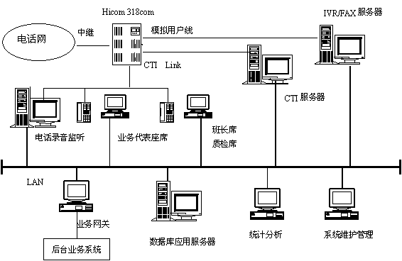 主要包括:Siemens Hicom 318com交換機、CTI服務器、IVR/FAX服務器、業(yè)務代表座席、班長和質(zhì)檢座席、電話錄音監(jiān)聽系統(tǒng)、數(shù)據(jù)庫應用服務器、統(tǒng)計分析工作站、系統(tǒng)維護管理工作站、業(yè)務網(wǎng)關、網(wǎng)絡系統(tǒng),其邏輯結構下圖所示。