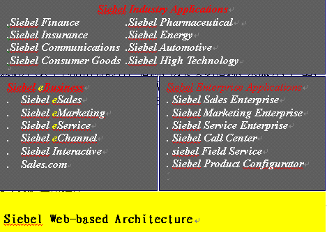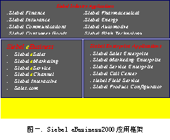 Siebel系統(tǒng)公司是全球領先的基于Web的前端軟件系統(tǒng)供應商,其Siebel eBusiness 2000系列產品更是處于市場的領先地位。Siebel ebusiness2000能夠實現以客戶為中心進行多種接觸渠道(主要包括Internet、Web、E-mail、callcenter 呼入/呼出、 市場服務、 電話銷售、領域銷售、領域服務、分銷商/渠道伙伴等)的市場銷售、市場營銷、服務等功能, 通過創(chuàng)建一個統(tǒng)一的面向客戶的信息數據庫(其中包括所有的客戶信息、歷史交易信息、及服務、產品、客戶接觸信息等),可以使企業(yè)能夠以統(tǒng)一的視角面對客戶;同時,客戶也可以選擇任何接觸渠道與企業(yè)進行溝通。Siebel eBusiness2000產品主要分為以下三大系列,如圖一所示(點擊圖片放大)。