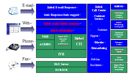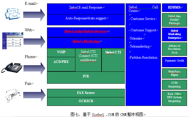 電子商務網站的運作和企業(yè)網站的建設,為其帶來了更多的市場商機,嶄新的客戶接觸的機會?蛻粼谝幻腌妰染湍軟Q定是選擇你還是別人,可以說未來網戰(zhàn)、傳統(tǒng)企業(yè)的競爭就是客戶關系的競爭;網站要生存,企業(yè)要發(fā)展,關鍵要在發(fā)展客戶關系上下功夫。如何涉足CRM領域,如何盡快地利用CRM先進的客戶關系管理理念,是擺在網站和傳統(tǒng)企業(yè)面前的一個棘手問題。以基于Siebel .COM應用為涉足CRM的切入點,使企業(yè)能夠更好地實施電子商務計劃,積極發(fā)展基于Web的客戶關系管理,最終使網站和企業(yè)真正成為接觸客戶、了解客戶、服務于客戶的商務平臺,繼而不斷向完整的企業(yè)級CRM目標邁進。圖七展示出完整的基于Siebel .COM的CRM視圖。