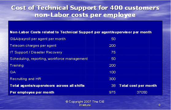 根據(jù)圖表12,我們可以算出第二種方式的利潤(rùn)百分比。如果我們假設(shè)每個(gè)客戶每年的收入是20,000美元,其中分配給呼叫中心部門的收入是20%。我們每個(gè)客戶每月的收入是333.33美元,每個(gè)客戶月的成本是223.88美元(參見(jiàn)圖表10)。這導(dǎo)致我們來(lái)自每個(gè)客戶每月的利潤(rùn)是109.46美元——這將產(chǎn)生33%的利潤(rùn)率。