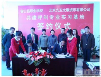 12月18日上午,密云縣職業(yè)學(xué)校與北京九五太維資訊有限公司校企合作共建呼叫專業(yè)實(shí)習(xí)基地簽約儀式在密云縣職業(yè)學(xué)校隆重舉行,市教委職成處處長(zhǎng)李敏,縣委常委副縣長(zhǎng)王春林、副縣長(zhǎng)錢(qián)福生、副縣長(zhǎng)徐芳出席簽約儀式并發(fā)表了講話。密云縣教委主任李鐘勤,北京九五太維資訊有限公司董事長(zhǎng)汪遠(yuǎn),首席執(zhí)行官李寶民及其培訓(xùn)師團(tuán)隊(duì),密云縣經(jīng)濟(jì)開(kāi)發(fā)區(qū)總公司及部分入?yún)^(qū)呼叫企業(yè)出席了簽約儀式。此次活動(dòng)標(biāo)志著北京呼叫中心產(chǎn)業(yè)基地人才培養(yǎng)工作步入正軌,隨著以密云縣職業(yè)學(xué)校為主體的人才培養(yǎng)模式的確立,長(zhǎng)期困擾呼叫行業(yè)人才短缺的困難有望得到解決。