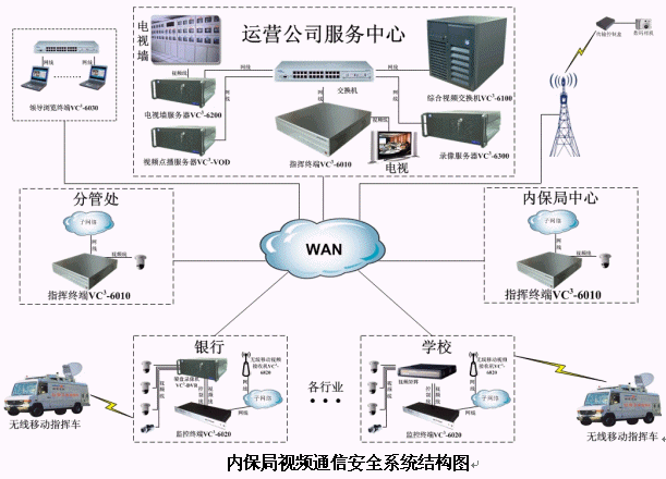 針對以上情況,北京華緯訊電信技術(shù)有限公司基于最新推出的VC3-6000綜合視頻通信平臺提出了針對性的"城市安保聯(lián)動(dòng)視頻通信平臺"解決方案。該平臺整合多種資源,實(shí)現(xiàn)了視頻指揮調(diào)度、遠(yuǎn)程視頻監(jiān)控、視頻會(huì)議、視頻點(diǎn)播、無線移動(dòng)視頻接入、高清晰圖片傳輸和環(huán)境監(jiān)測等功能。平臺組成如下圖: