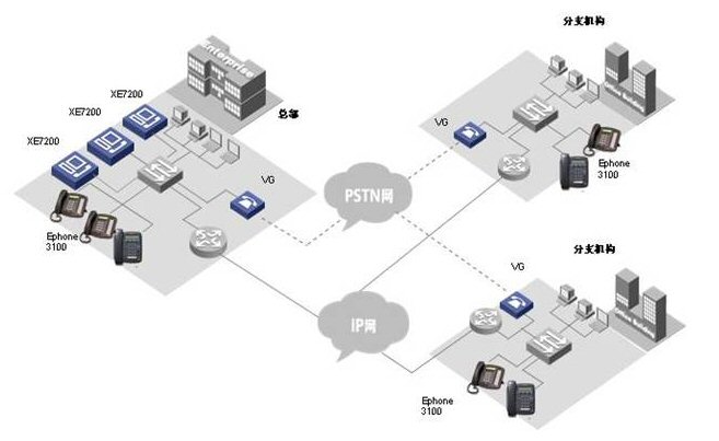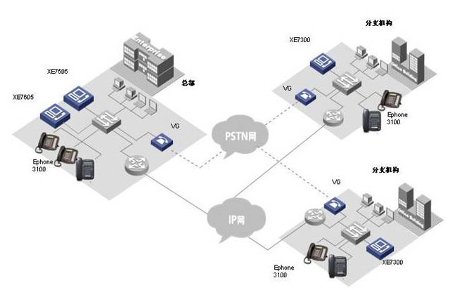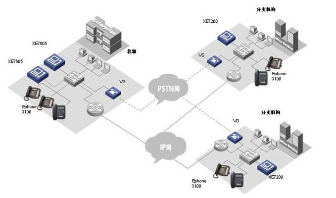 各小分支機(jī)構(gòu)的IP語音終端可以直接注冊到本地XE 7000上, 從而實(shí)現(xiàn)整網(wǎng)的分布式部署。