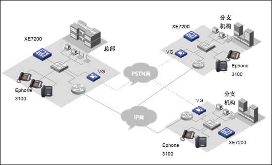 當企業(yè)存在多個大型分部的時候,如一個國際性公司。則可以在各個分部部署XE7000冗余方案,每個分部維護獨立的本地用戶信息。各小分支機構的IP語音終端可以直接注冊到本地XE7000上,從而實現(xiàn)整網(wǎng)的分布式部署。
