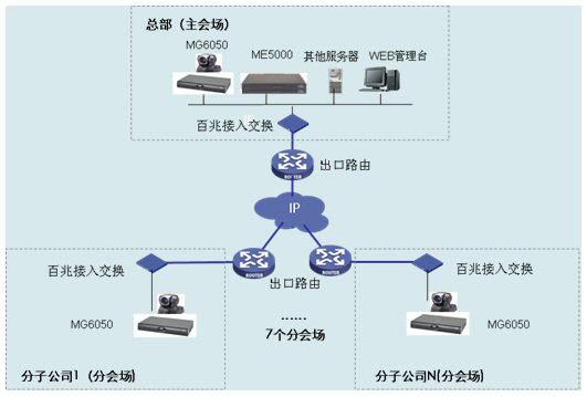 集團(tuán)總部主會(huì)場和各個(gè)分會(huì)場各部署一臺(tái)H3C公司的MG6050多媒體網(wǎng)關(guān),同時(shí)支持H.323和SIP協(xié)議,支持H.263/H.264編碼技術(shù)和4CIF高清晰圖像分辨率,最高可以提供2M會(huì)議帶寬。集團(tuán)總部主會(huì)場和各個(gè)分會(huì)場推薦使用Sony