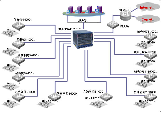 S8505萬(wàn)兆核心路由交換機(jī)作為整個(gè)網(wǎng)絡(luò)的核心,以高密度、大容量的轉(zhuǎn)發(fā)性能為豐富的業(yè)務(wù)提供支持。Quidway? S8505萬(wàn)兆核心路由交換機(jī)具備178Mpps的處理能力,300G的交換容量,并可以升級(jí)到600G;接入采用為教育行業(yè)定制的E026/E050交換機(jī),實(shí)現(xiàn)整網(wǎng)的安全接入的完善的帶寬管理功能。網(wǎng)絡(luò)出口采用NE20-8第五代路由器實(shí)現(xiàn)雙出口,實(shí)現(xiàn)靈活的路由策略。