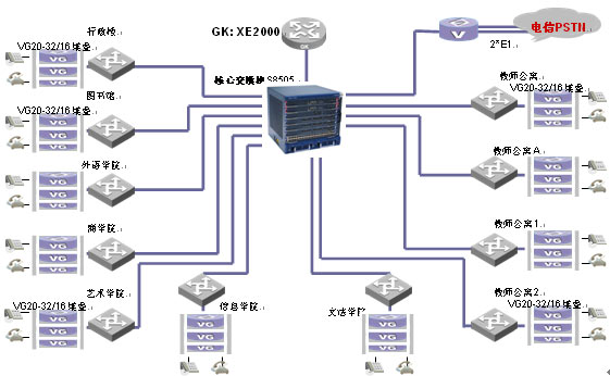 IP語(yǔ)音網(wǎng)采用華為3Com全系列語(yǔ)音視訊產(chǎn)品。為了滿足學(xué)校通訊的需求,華為3Com選用Quidway XE2000 IP PBX語(yǔ)音服務(wù)器作為核心呼叫控制設(shè)備,作為獨(dú)立控制的語(yǔ)音服務(wù)器,網(wǎng)絡(luò)規(guī)劃完®全自主,實(shí)現(xiàn)快速部署。采用50余臺(tái)ViewPoint®