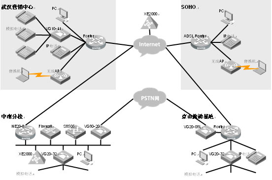 通過(guò)在公網(wǎng)部署XE2000語(yǔ)音服務(wù)器實(shí)現(xiàn)IP語(yǔ)音網(wǎng)絡(luò)向廣域網(wǎng)的擴(kuò)展,實(shí)現(xiàn)IP語(yǔ)音無(wú)處不在,內(nèi)部電話完全免費(fèi)。公網(wǎng)XE2000與中南分校局域網(wǎng)XE2000配合輕松實(shí)現(xiàn)NAT/FW穿透,無(wú)需添置任何其他設(shè)備,對(duì)已有NAT/FW設(shè)備影響小。
