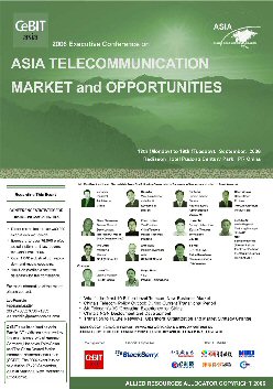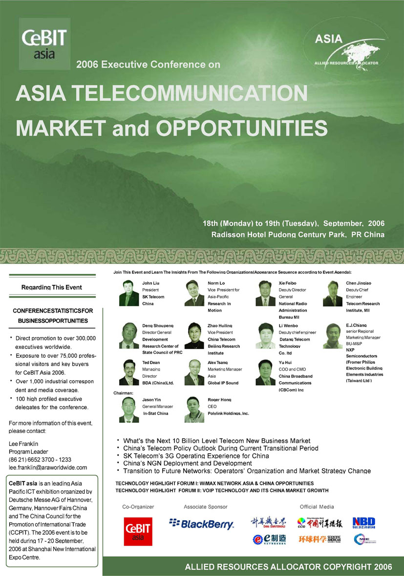 2006亞洲信息及通信技術(shù)展覽會(huì),即亞洲CeBIT展將于今年9月17日至20日在上海新國(guó)際博覽中心召開(kāi)。由中國(guó)國(guó)際貿(mào)促會(huì)電子信息行業(yè)分會(huì)與德國(guó)漢諾威展覽公司聯(lián)合主辦的這一展會(huì),近300家國(guó)內(nèi)外廠(chǎng)商參展,將分為數(shù)字設(shè)備及系統(tǒng)、商務(wù)應(yīng)用、通信三大展區(qū),多方位展現(xiàn)ICT行業(yè)的最新趨勢(shì),并成為業(yè)內(nèi)廠(chǎng)商的專(zhuān)業(yè)貿(mào)易平臺(tái)。本次CeBIT展會(huì)期間(9月18、19日兩天),將在浦東證大麗笙酒店召開(kāi)“2006亞洲通信及信息市場(chǎng)管理層論壇”。包括中國(guó)國(guó)家信息產(chǎn)業(yè)部、中國(guó)電信、韓國(guó)SK電訊、BDA中國(guó)等多家政府機(jī)關(guān)、運(yùn)營(yíng)商、制造商將參加本次論壇,并做重要發(fā)言。
