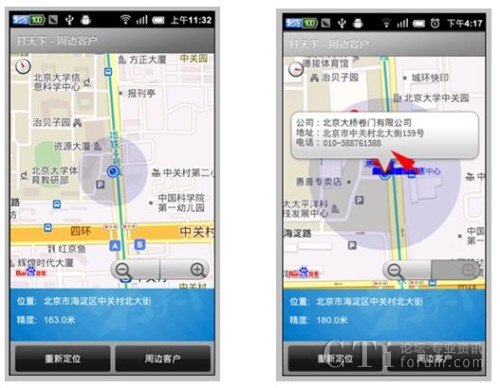 其二,打天下2.0新增了LBS的服務(wù)功能,原有的打天下只能實(shí)現(xiàn)拍照上傳、簽到等簡單功能應(yīng)用,而新版本則可以提供check的位置服務(wù),通過check可以在地圖上顯示標(biāo)記地點(diǎn)周邊分布的客戶地理位置信息,極大方便了外勤員工的路線制訂。