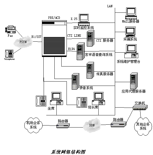 本系統(tǒng)采用E1數(shù)字中繼線接入電話網(wǎng),成為能夠在聲訊臺(tái)或機(jī)場(chǎng)獨(dú)立運(yùn)行的系統(tǒng)。