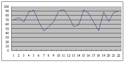底下這是某呼叫中心從早上8點(diǎn)開(kāi)始,一直到晚上6點(diǎn),每隔半個(gè)小時(shí)的服務(wù)水平。可以很清楚的看到,服務(wù)水平在91到48這中間震蕩,平均服務(wù)水平是73左右。