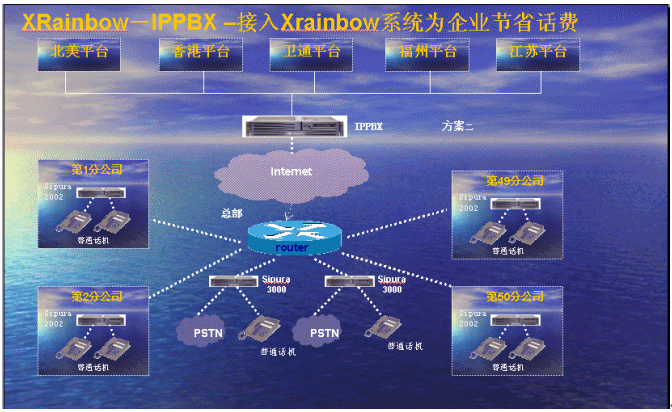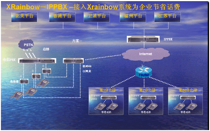該公司目前在全國各地都有辦公地點,沒有傳統(tǒng)的PBX交換機,有100條外線接入。有50個分公司,每個分公司有2門外線。該公司有很大的話務(wù)量,希望能通過解決方案實現(xiàn)各個公司內(nèi)部、各個公司之間互打免費,撥打低資費的國內(nèi)、國際長途電話。