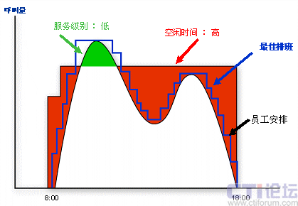 如果僅僅是工作量大,我想排班員還能夠忍受,更要命的是,排出的班表不能做到精確。要么人員太多,導致運營成本上升;要么人員不夠,無法達到預期的服務目標。以呼叫中心典型的雙峰曲線為例(如右圖),排班所追求的是人力安排和話務曲線的盡可能吻合(也就是圖中藍色的最佳排班線),達到在滿足服務水平的基礎上盡可能少的安排座席資源。而在手工排班中,由于大量的采用組排班,組中成員同時上下班、同時午餐,導致人力安排的靈活性降低,不能盡可能的去擬合話務曲線。此外,參考前面談到的影響人力安排的因素,手工排班中考慮了環(huán)境的影響,部分考慮了縮減,但座席技能因素考慮很少,基本認為所有人員的技能熟練度一致,不可預見性縮減也沒有考慮進去,導致最終會對服務水平造成負面影響。因此,手工排班是一種粗放型的排班方式,隨著運營要求的提高,表現出一定的不適應性。