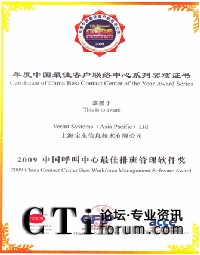 客戶聯(lián)絡(luò)中心標(biāo)準(zhǔn)委員會(huì)層層評(píng)估和共同審定,上海寶東(DataTool)及VERINT雙雙獲得“2009中國呼叫中心排班管理軟件獎(jiǎng)”,這一大獎(jiǎng)的頒發(fā)是ICMI對(duì)寶東及VERINT的肯定與支持,代表著權(quán)威機(jī)構(gòu)對(duì)VERINT的WFM排班管理軟件在呼叫中心行業(yè)中的貢獻(xiàn)及對(duì)寶東公司技術(shù)服務(wù)能力的認(rèn)可及肯定。