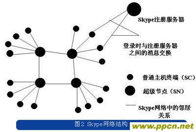 與常規(guī)的電信業(yè)務(wù)網(wǎng)絡(luò)不同的是,Skype的網(wǎng)絡(luò)中除了注冊服務(wù)器,沒有其他任何集中的服務(wù)器,只是將用戶節(jié)點(diǎn)分為普通節(jié)點(diǎn)和超級節(jié)點(diǎn)。Skype的系統(tǒng)連接結(jié)構(gòu)如圖2所示。