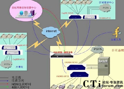 - 利用公共寬帶網(wǎng)絡(luò)(或公司內(nèi)部VPN網(wǎng)),實(shí)現(xiàn)總公司和各個(gè)分公司之間IP電話互通功能,傳真功能。從而免除總公司和各個(gè)分公司內(nèi)部溝通的通話費(fèi)用和傳真費(fèi)用;