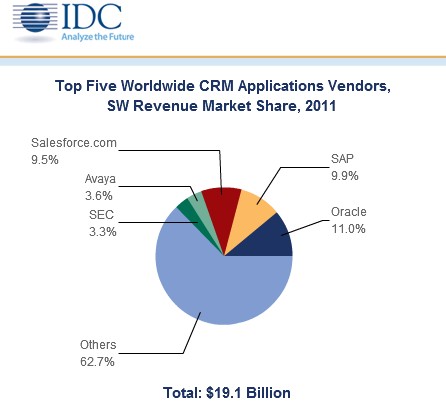 IDC追蹤調(diào)查了超過190個(gè)分立的CRM供應(yīng)商,發(fā)現(xiàn)他們的總營(yíng)收增長(zhǎng)速率在2011年下半年開始減緩。最終,2011年CRM市場(chǎng)營(yíng)收增長(zhǎng)率達(dá)到了11.2%。