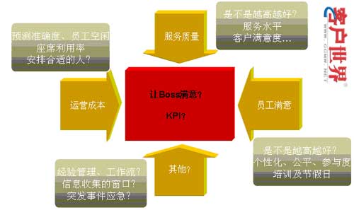 所以,我們認(rèn)為呼叫中心的運(yùn)營解決方案,應(yīng)該綜合協(xié)調(diào)人力資源管理、話務(wù)預(yù)測、自動排班、績效考評、話務(wù)分析、現(xiàn)場管理、實(shí)時預(yù)警等各個現(xiàn)場管理要素。各個要素之間即是相互獨(dú)立,又相互關(guān)聯(lián)的,系統(tǒng)通過設(shè)置目標(biāo)值,達(dá)到管理目標(biāo)的均衡,這個平衡,從最核心的體現(xiàn)來看,就是一個完整的KPI體系中各個指標(biāo)的實(shí)現(xiàn)。