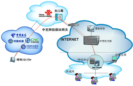 企業(yè)或個(gè)人自行從網(wǎng)站上成功申請(qǐng)“企業(yè)商務(wù)通”或“個(gè)人隨身行”業(yè)務(wù)后,通過101756*全國(guó)統(tǒng)一接入號(hào)結(jié)合中寬網(wǎng)信推薦的思科linksys網(wǎng)關(guān)或網(wǎng)絡(luò)電話使用,當(dāng)外部對(duì)您申請(qǐng)的10175*號(hào)碼發(fā)起呼叫時(shí),該呼叫通過中國(guó)聯(lián)通的線路將話務(wù)指向中寬網(wǎng)信的媒體網(wǎng)關(guān),由中寬軟交換平臺(tái)將呼叫送至您指定的電話上。另外,當(dāng)您使用該業(yè)務(wù)外呼時(shí),可以選擇在被叫電話上顯示10175*或隱藏號(hào)碼。