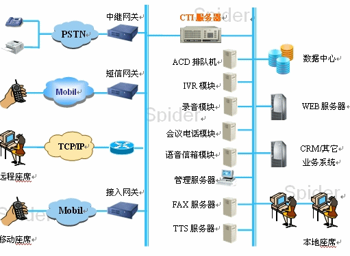 - 座席終端:座席使用的終端可以是IP電話、軟電話、手機(jī)(移動(dòng)坐席)、普通電話用戶(hù)等。如果用戶(hù)原來(lái)的終端為普通電話的話,可以通過(guò)IAD即可接入到系統(tǒng)網(wǎng)絡(luò)中,因此節(jié)省了用戶(hù)的投資。