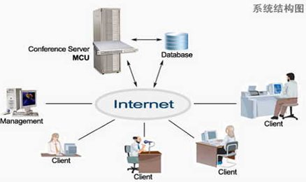 經(jīng)過種種測試,最后選定視維Super-V視頻會議系統(tǒng),山大聯(lián)潤研發(fā)的視維視頻會議系統(tǒng)由服務(wù)器端軟件和客戶端軟件兩部分組成。其中安裝服務(wù)器端軟件的PC服務(wù)器必須有公網(wǎng)固定的IP地址;有較好的網(wǎng)絡(luò)帶寬條件,以保證正常的音視頻信號的傳輸。所有會議成員都需要在其個人計算機上安裝客戶端軟件,可以根據(jù)具體情況接入IP網(wǎng)絡(luò)。視維Super-V視頻會議系統(tǒng)將所參會人員通過IP網(wǎng)絡(luò)連接起來,提供音頻、視頻以及數(shù)據(jù)協(xié)作等通訊服務(wù)。其網(wǎng)絡(luò)拓撲圖如下: