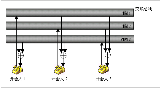 由于會(huì)議的資源是分布在各個(gè)通道,因此電話(huà)會(huì)議功能可以具有極大的靈活性,只有一塊卡的小系統(tǒng)也可以擁有電話(huà)會(huì)議功能,既可以召開(kāi)所有通道參加的大會(huì)議,也可以同時(shí)召開(kāi)一系列參加人數(shù)不同的小會(huì)議,會(huì)議功能的各項(xiàng)指標(biāo),如會(huì)議數(shù)目,會(huì)議參加人數(shù),發(fā)言人數(shù)等基本上都不受限制。下圖以一個(gè)三方會(huì)議的實(shí)現(xiàn)說(shuō)明分布式電話(huà)會(huì)議的概念。