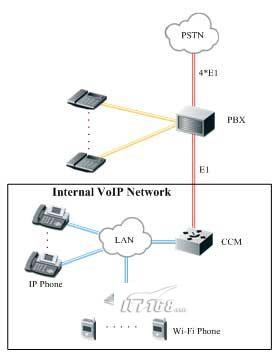 酒店申請了4條到CNC的E1線路,用于語音呼叫業(yè)務(wù),同時內(nèi)部還建設(shè)有覆蓋整個酒店的VoIP網(wǎng)絡(luò),通過CCM系統(tǒng)進(jìn)行集中管理,CCM系統(tǒng)與PBX之間通過E1線進(jìn)行連接。