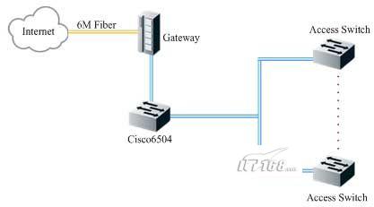 客房局域網(wǎng)通過一條6M的光纖接入CNC網(wǎng)絡(luò),網(wǎng)關(guān)設(shè)備承擔(dān)了DHCP、NAT和流量限制等功能,同時在思科6504上安裝有安全板卡,對內(nèi)部網(wǎng)絡(luò)安全進(jìn)行加強(qiáng)和防御。由于每個客房有2~3個信息點(diǎn),客房局域網(wǎng)總共有1300個左右的信息點(diǎn)。