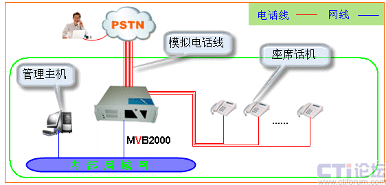 4. 用電話線將座席電話機(jī)與MVB2000相連,將電話線插到MVB2000的FXS接口卡的對應(yīng)接口;