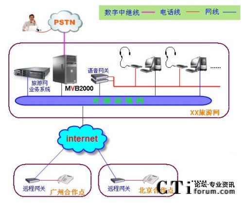 在技術(shù)上,旅游網(wǎng)IP呼叫中心解決方案的語音業(yè)務(wù)通過電信運(yùn)營商的模擬電話線路(或者模擬中繼線路)接入,數(shù)據(jù)業(yè)務(wù)都通過互聯(lián)網(wǎng)使用TCP/IP協(xié)議傳送,解決了呼叫中心中大量數(shù)據(jù)傳送的需求,請(qǐng)看下面的網(wǎng)絡(luò)組織結(jié)構(gòu)圖: