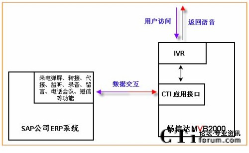 通過(guò)集成,不但可以實(shí)現(xiàn)與SAP公司ERP系統(tǒng)的實(shí)時(shí)數(shù)據(jù)傳輸,實(shí)現(xiàn)客戶管理、日常辦公,并且可使ERP系統(tǒng)上具有:點(diǎn)擊外呼、批量外呼、來(lái)電彈屏、收聽(tīng)錄音、查看報(bào)表、監(jiān)控電話線路等更多增值功能,詳細(xì)接口內(nèi)容見(jiàn)《MVB2000 WEB開(kāi)發(fā)接口》。