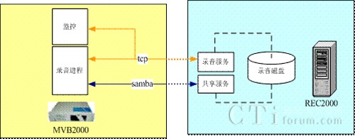 REC2000 是通過(guò)網(wǎng)絡(luò)共享方式,接收來(lái)自MVB2000通信平臺(tái)的錄音數(shù)據(jù)。將大量的磁盤讀寫動(dòng)作分離,然后接收來(lái)自通信平臺(tái)的指令進(jìn)行錄音處理,從而有效降低MVB2000通信平臺(tái)CPU和磁盤負(fù)載。提供運(yùn)行監(jiān)控接口,通過(guò)通信平臺(tái)可實(shí)時(shí)監(jiān)控錄音服務(wù)器運(yùn)行狀態(tài)。