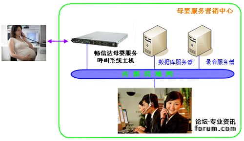 暢信達(dá)母嬰服務(wù)呼叫系統(tǒng)是以母嬰服務(wù)呼叫系統(tǒng)主機(jī)為呼叫交換和業(yè)務(wù)受理平臺(tái),選配數(shù)據(jù)庫(kù)服務(wù)器和錄音服務(wù)器,采用人工座席發(fā)起呼叫并接聽(tīng)來(lái)電,系統(tǒng)架構(gòu)圖如下: