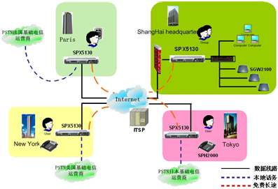 隨著公司在全世界開設(shè)眾多的部門,IP電話技術(shù)將會是不同分公司之間實現(xiàn)低費用高品質(zhì)語音通訊的方式。SINOCO公司的IP-PBX 系統(tǒng)解決方案,利用 SPX-5130設(shè)備通過互連網(wǎng)連接到公司的各個分支機(jī)構(gòu),提供分級體系結(jié)構(gòu),更進(jìn)一步提供了可靠的,靈活的語音通訊解決方案,從而滿足公司快速回應(yīng)客戶的需求。同時,它也降低了總部和分部之間的電話費用。總部和分部間昂貴的國際電話費用將不再存在, 而且享受高品質(zhì)的語音通訊質(zhì)量。