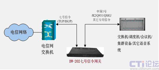 BW-202七號信令網(wǎng)關可實現(xiàn)多種信令方式與七號信令之間的互通。在當前的電信網(wǎng)絡中,七號信令(SS7)系統(tǒng)已經(jīng)廣泛應用,但很多傳統(tǒng)設備都還不具有七號信令接口,有些設備即使具有但也不標準,BW-202七號信令網(wǎng)關能以最經(jīng)濟的方式幫助這些設備以標準的信令方式與七號信令設備連接, 其典型用法如圖所示: